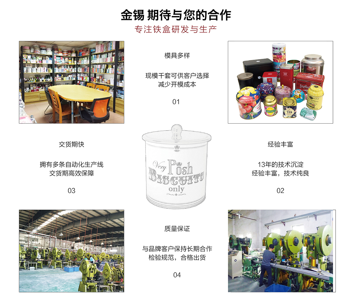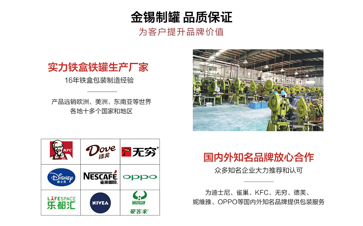 廣州市金錫五金制品有限公司成立于2016年,是已有13年生產(chǎn)經(jīng)驗的實力廠家。我廠是專業(yè)定制優(yōu)良馬口鐵盒、鐵罐、禮品盒、茶葉罐、月餅盒等金屬鐵盒包裝的制罐企業(yè),我們擁有超過6000平方米的標(biāo)準(zhǔn)現(xiàn)代化廠房及八條生產(chǎn)線。公司集產(chǎn)品研發(fā)、設(shè)計、生產(chǎn)、銷售于一體,技術(shù)優(yōu)良,實力雄厚。通過十多年的制罐經(jīng)驗,我們擁有專業(yè)的技術(shù)團隊,嚴(yán)格的作業(yè)流程、完整的品質(zhì)保障體系、完善的銷售以及售后服務(wù)系統(tǒng)。